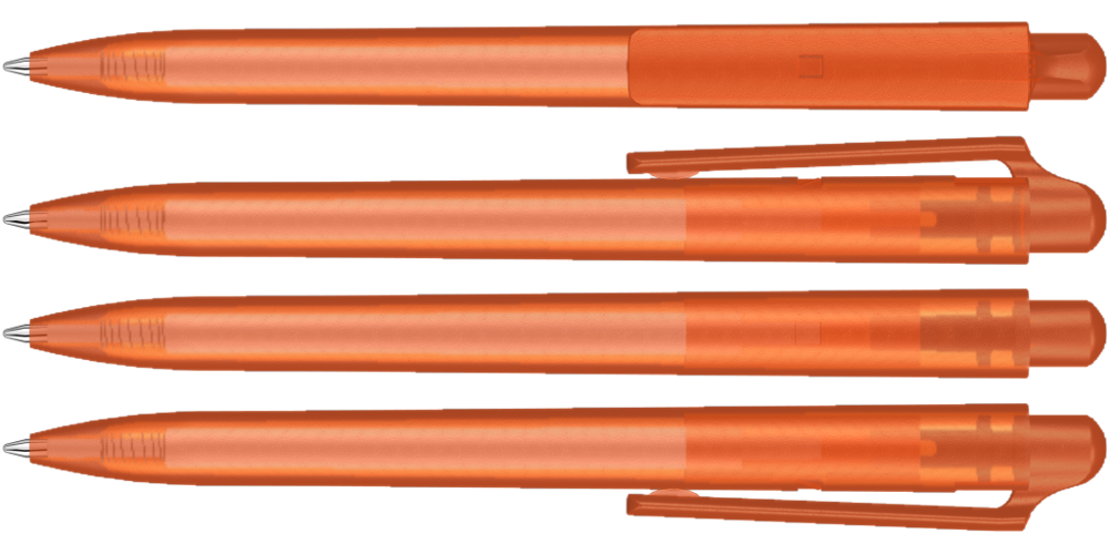 Druckkugelschreiber mit transparent gefrostetem Gehäuse und Clipdrücker.