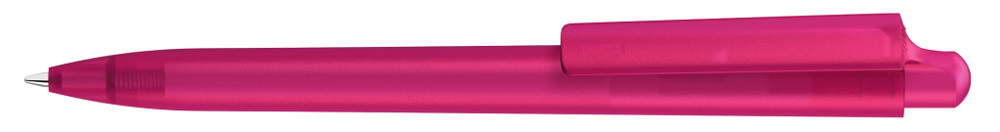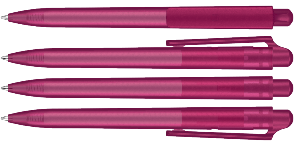 Druckkugelschreiber mit transparent gefrostetem Gehäuse und Clipdrücker.