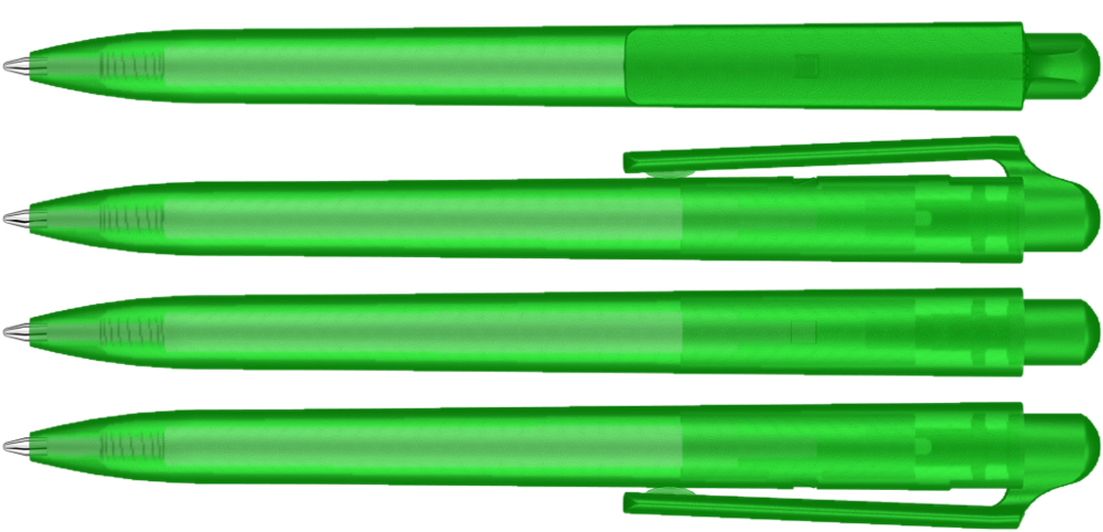 Druckkugelschreiber mit transparent gefrostetem Gehäuse und Clipdrücker.