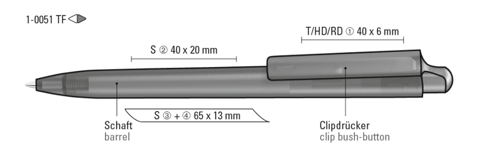 Druckkugelschreiber mit transparent gefrostetem Gehäuse und Clipdrücker.