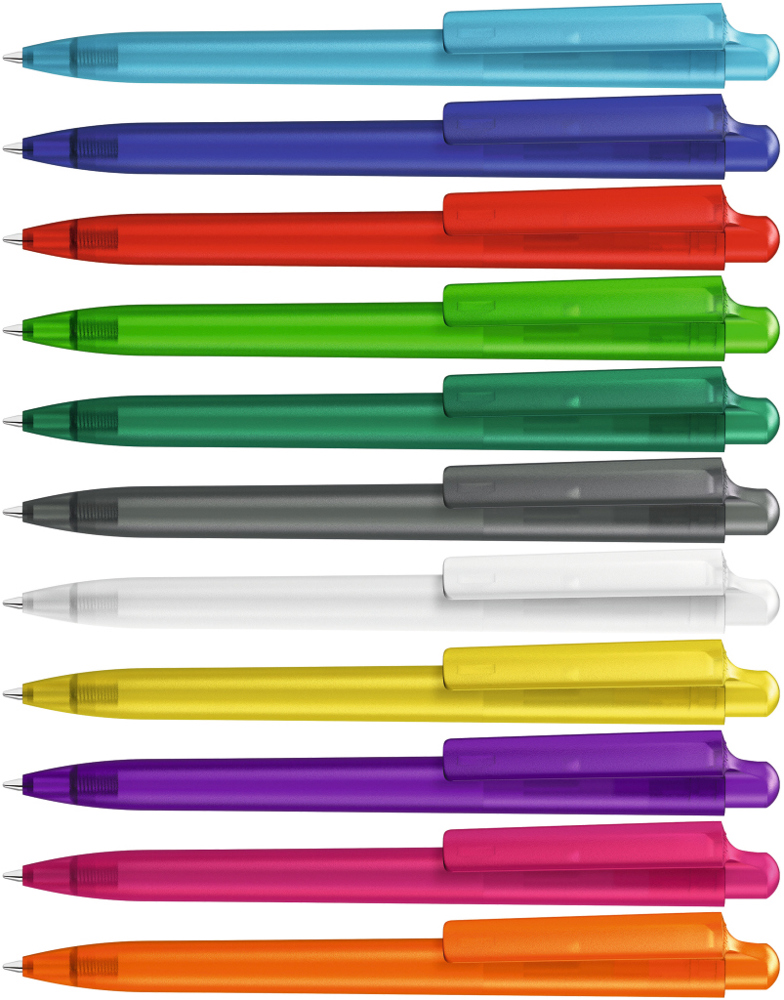 Druckkugelschreiber mit transparent gefrostetem Gehäuse und Clipdrücker. mehr