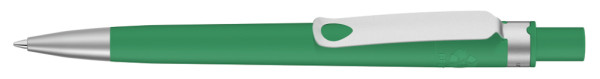 Druckkugelschreiber aus recyceltem PET-Material mit matt gedecktem Gehäuse. Metallclip und Metallspitze matt verchromt.