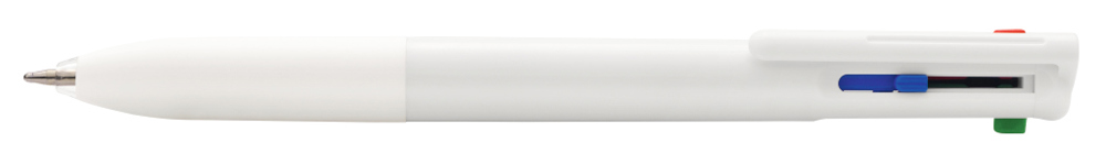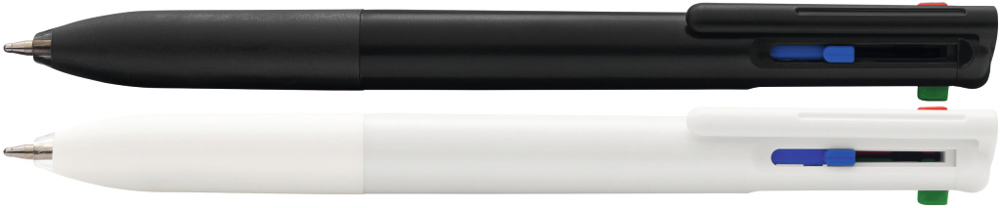 Vierfarb-Kugelschreiber mit den Schreibfarben schwarz, rot, blau und grün mit Gummigriffzone. Gehäuse unifarben gedeckt mit farbigen Schiebedrückern in der entsprechenden Schreibfarbe.