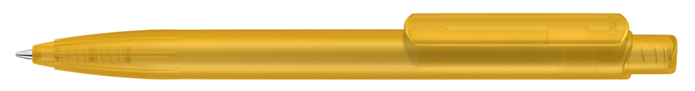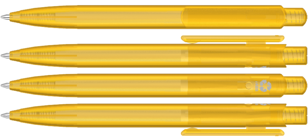 Druckkugelscheiber mit transparent gefrostetem Gehäuse, Clip und Drücker aus recyceltem ABS Kunststoff. Eingelassene Griffzone.