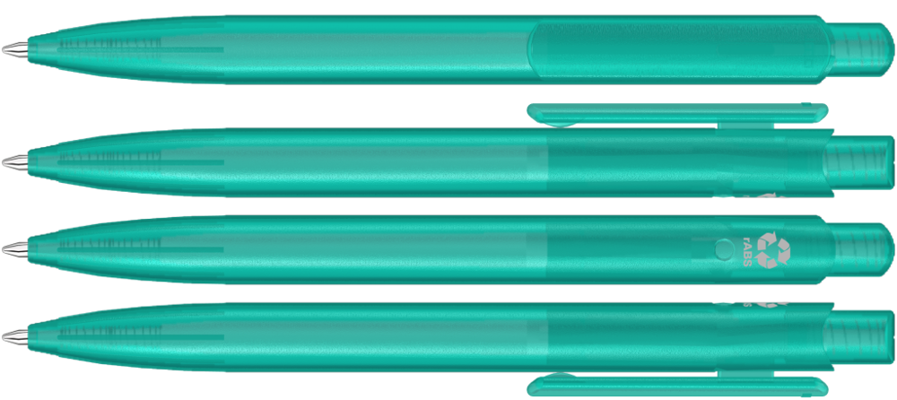 Druckkugelscheiber mit transparent gefrostetem Gehäuse, Clip und Drücker aus recyceltem ABS Kunststoff. Eingelassene Griffzone.