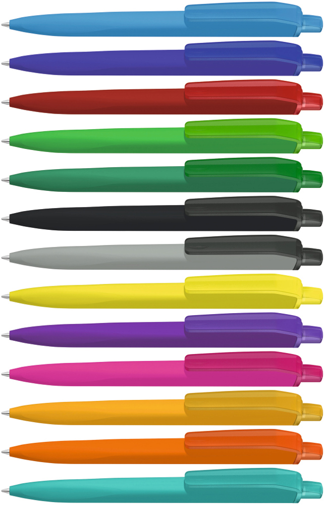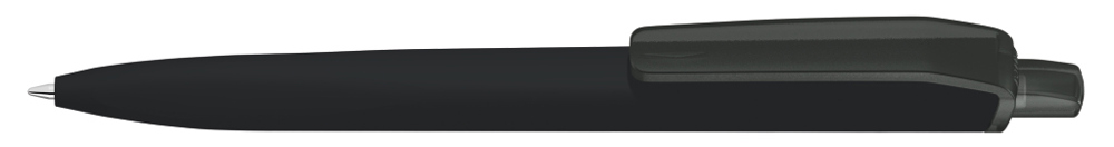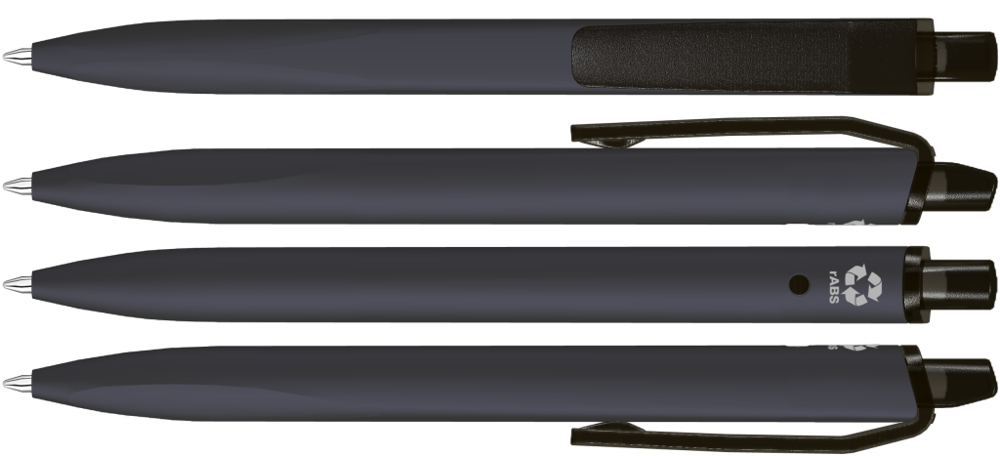 Druckkugelscheiber mit gummiertem Gehäuse aus recyceltem ABS-Kunststoff mit transparent gefrostetem Clip und Drücker. Griffzone ergonomisch geformt.