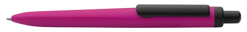Metall-Druckkugelschreiber mit gemetrisch wechselnder Schaftform, die sich zur Schreibspitze hin in eine prägnante Dreikantgeometrie verjüngt. Aluminiumgehäuse matt lackiert, Clip und Drücker in schwarz matt.
