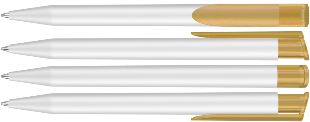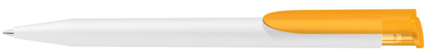 Druckkugelschreiber mit gedeckt mattem Gehäuse in weiß und farbig transparent gefrostetem Clipdrücker.
