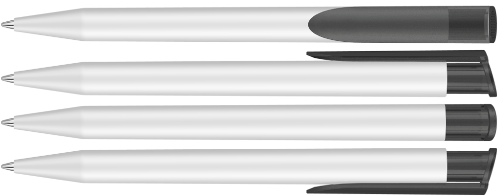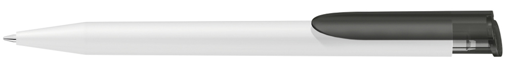 Druckkugelschreiber mit gedeckt mattem Gehäuse in weiß und farbig transparent gefrostetem Clipdrücker.