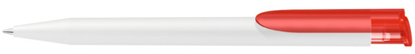 Druckkugelschreiber mit gedeckt mattem Gehäuse in weiß und farbig transparent gefrostetem Clipdrücker.