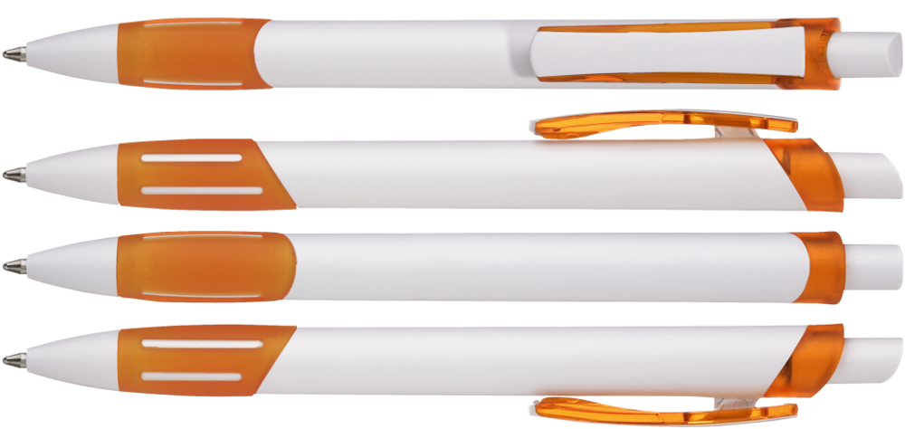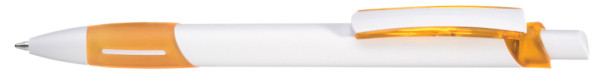 Druckkugelschreiber mit gedeckt weißem Gehäuse, transparent gefrosteter Gummigriffzone, Zierring und Clipschale.