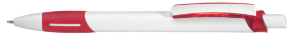 Druckkugelschreiber mit gedeckt weißem Gehäuse, transparent gefrosteter Gummigriffzone, Zierring und Clipschale.