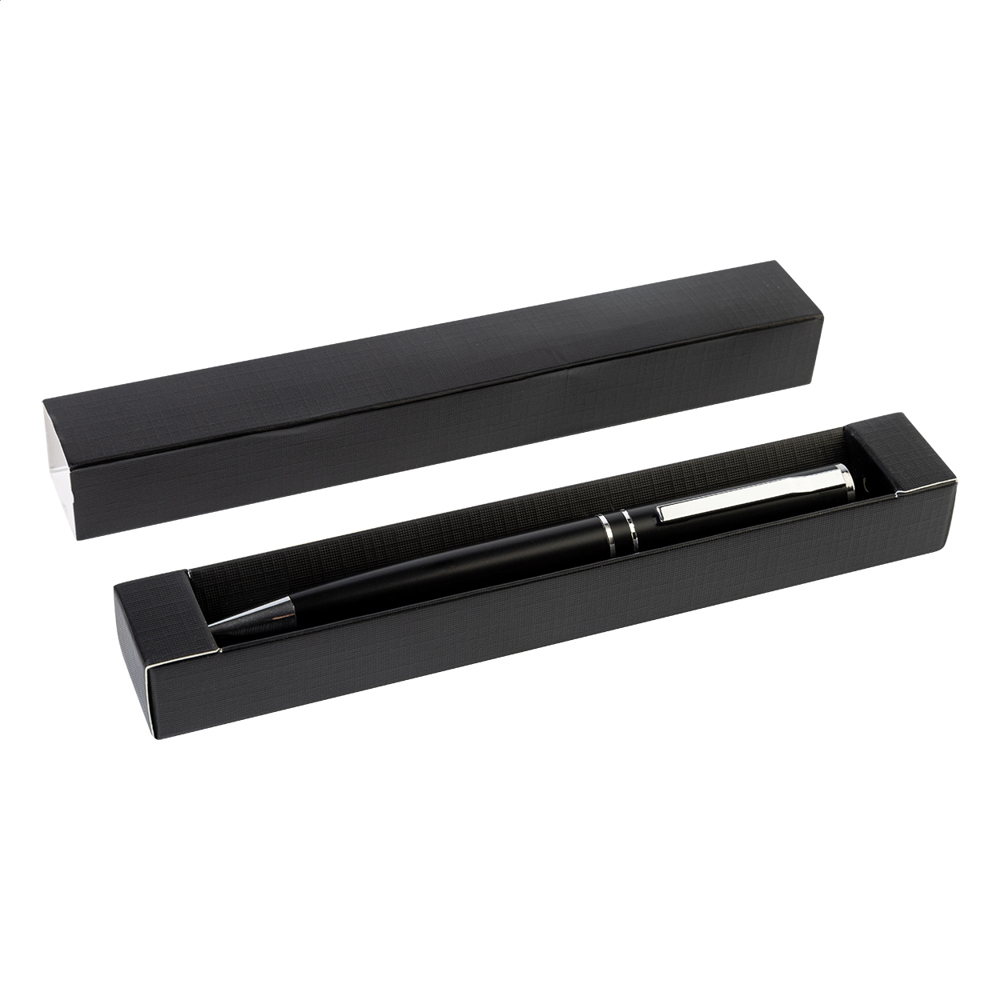 Drehkugelschreiber aus recyceltem Aluminium mit verchromten Elementen und Ringen. Einzeln in schwarzer Geschenkbox. Blauschreibend.