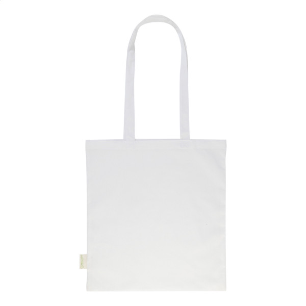 Einkaufstasche mit langen Henkeln. Material: 70% recycelte Baumwolle und 30% RPET Polyester, 140 g/m². Mit Label RPET.