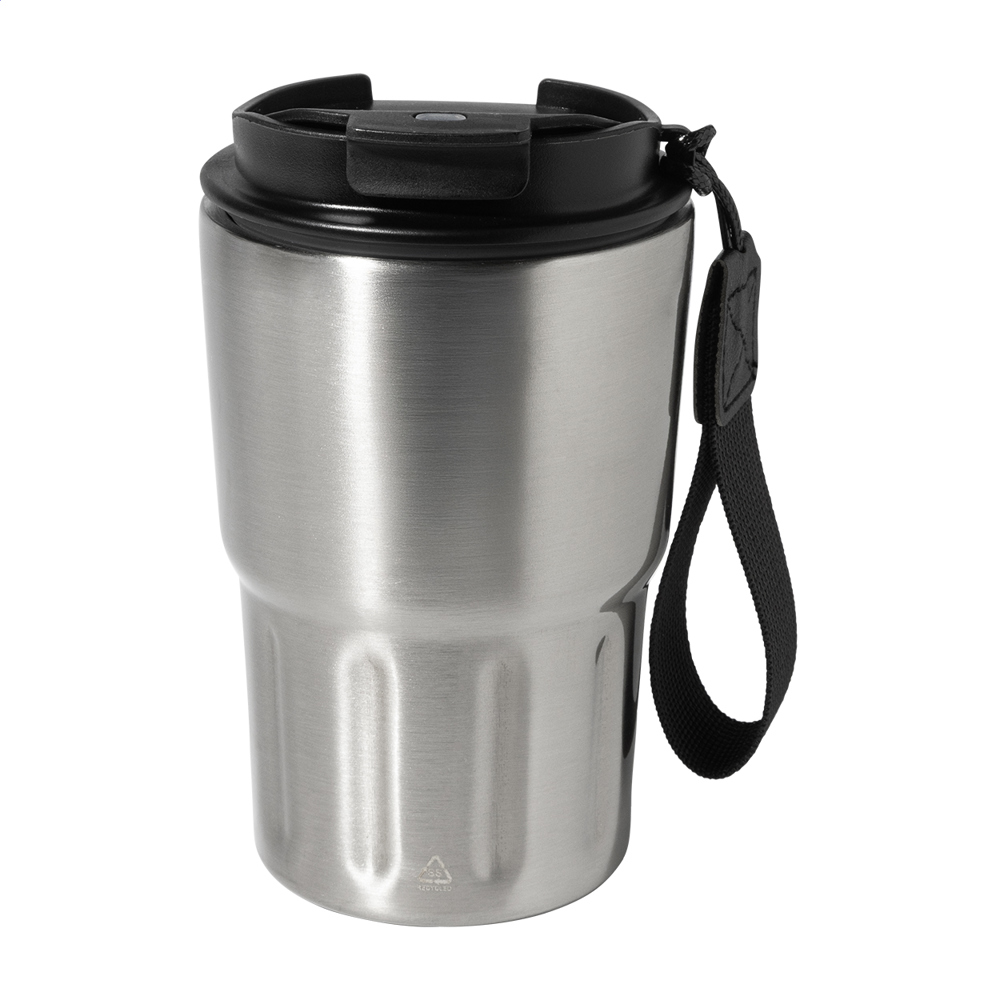 Doppelwandiger Isolierbecher aus recyceltem Edelstahl mit Trinkdeckel aus PP-Kunststoff und Trageschlaufe aus RPET-Polyester. Füllmenge: 350 ml.