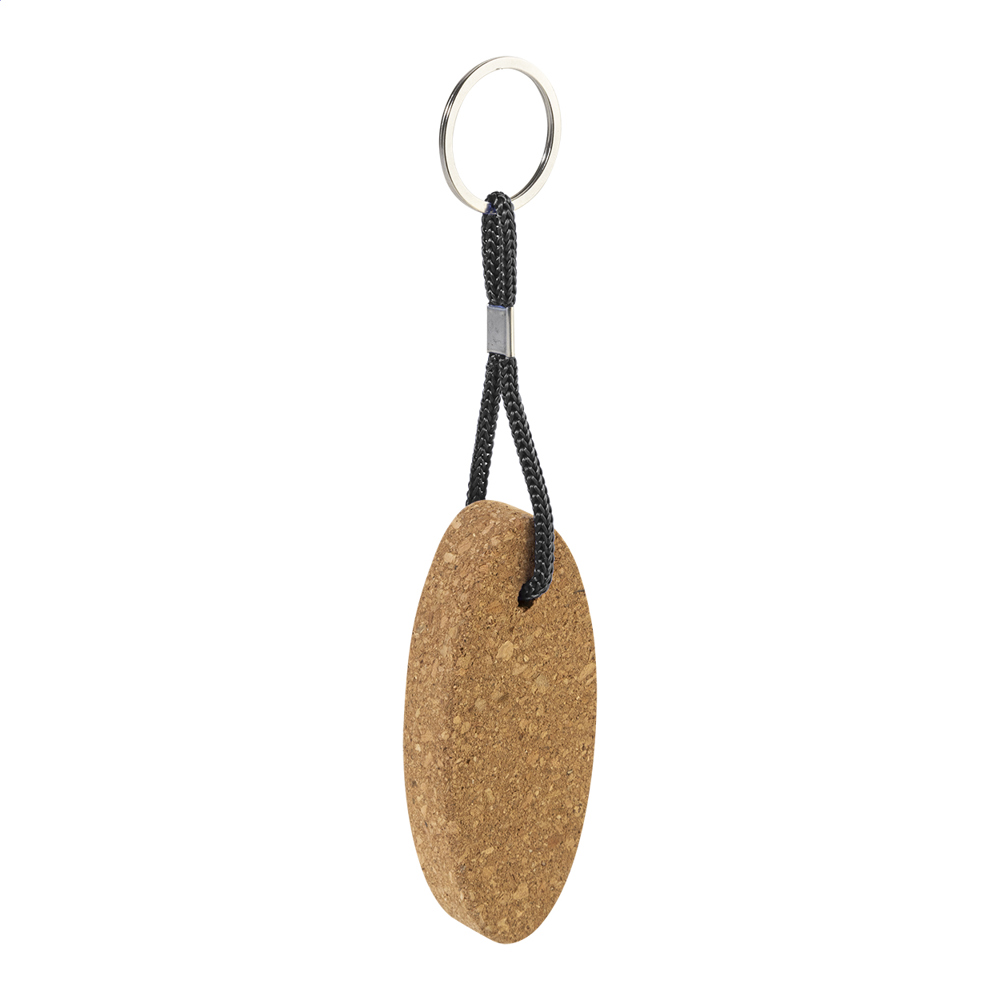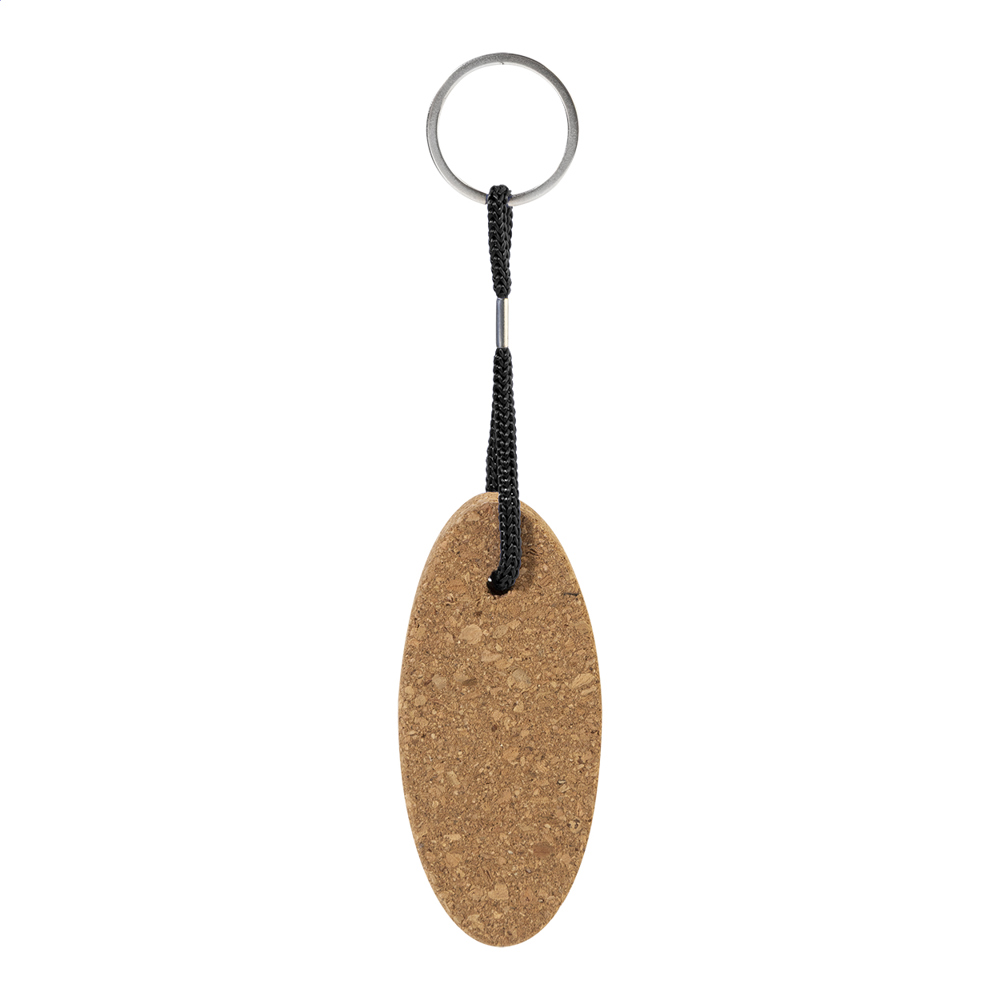 Schwimmbarer Schlüsselanhänger aus natürlichem Kork mit Polyesterkordel und Metallring.