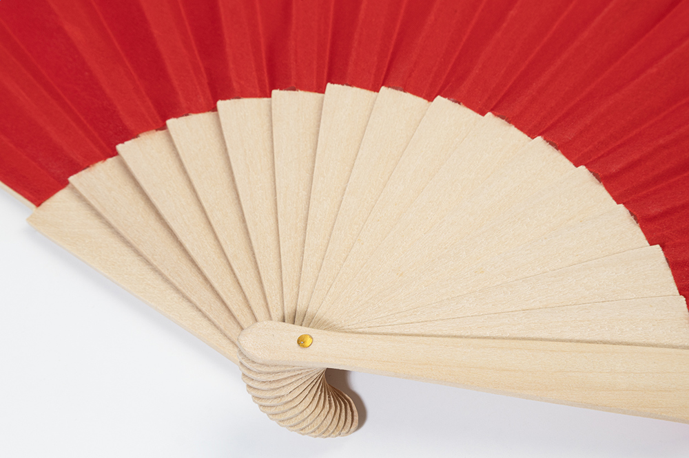 Handfächer aus RPET-Polyester mit Holzspeichen.