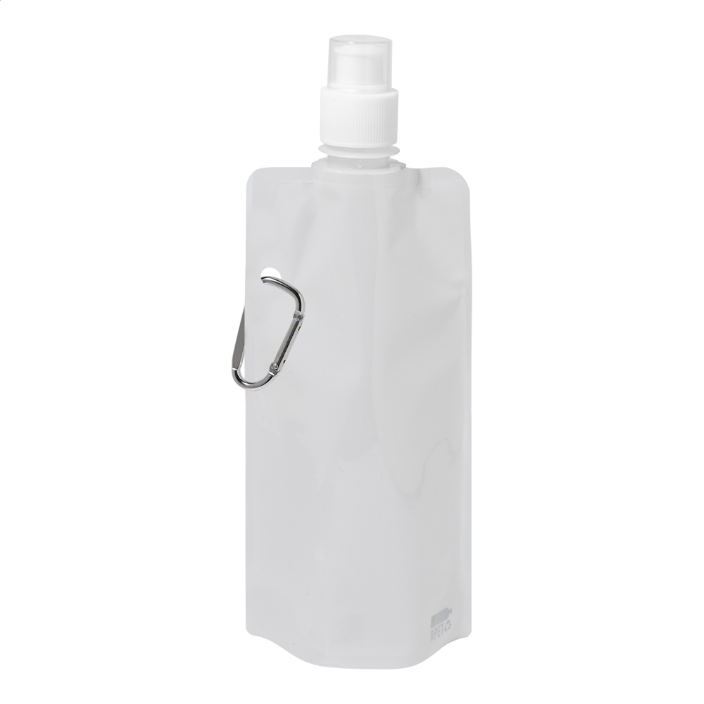 Faltbare RPET Trinkflasche mit Trinkdeckel und Karabiner aus Aluminium. Füllmenge: 500 ml. BPA-frei. Nicht geeignet für kohlensäurehaltige Getränke.