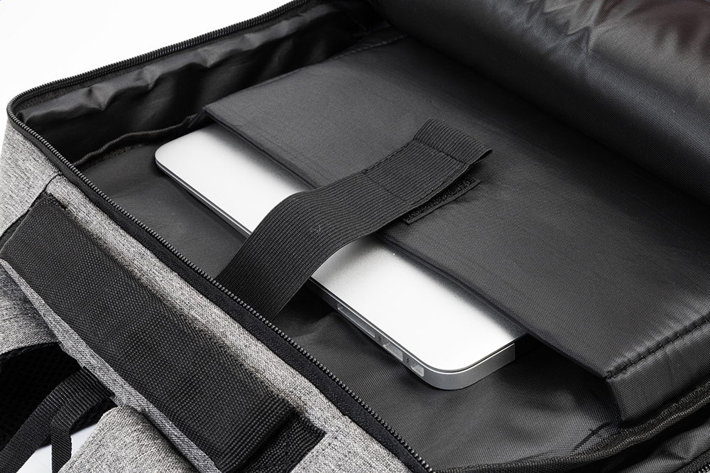 Rucksack aus RPET mit Reißverschluss-Hauptfächern, 2 Reißverschluss-Vordertaschen, Reißverschluss-Seitentaschen und gepolstertem Laptopfach (15"). Mit geposlterten Rücken und Schultergurten, Anti-Diebstahl-Fach und Trolley-Gurt. Material: 300D RPET Polyester. Mit Label RPET.