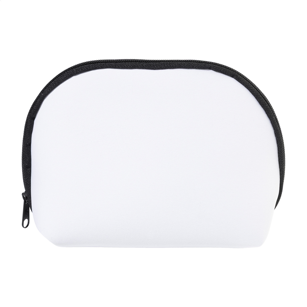 Individuelle Kosmetiktasche mit Reißverschluss aus RPET-Neopren mit vollflächigem Sublimationsdruck. Mit Label RPET. Mindestmenge: 50 Stk.