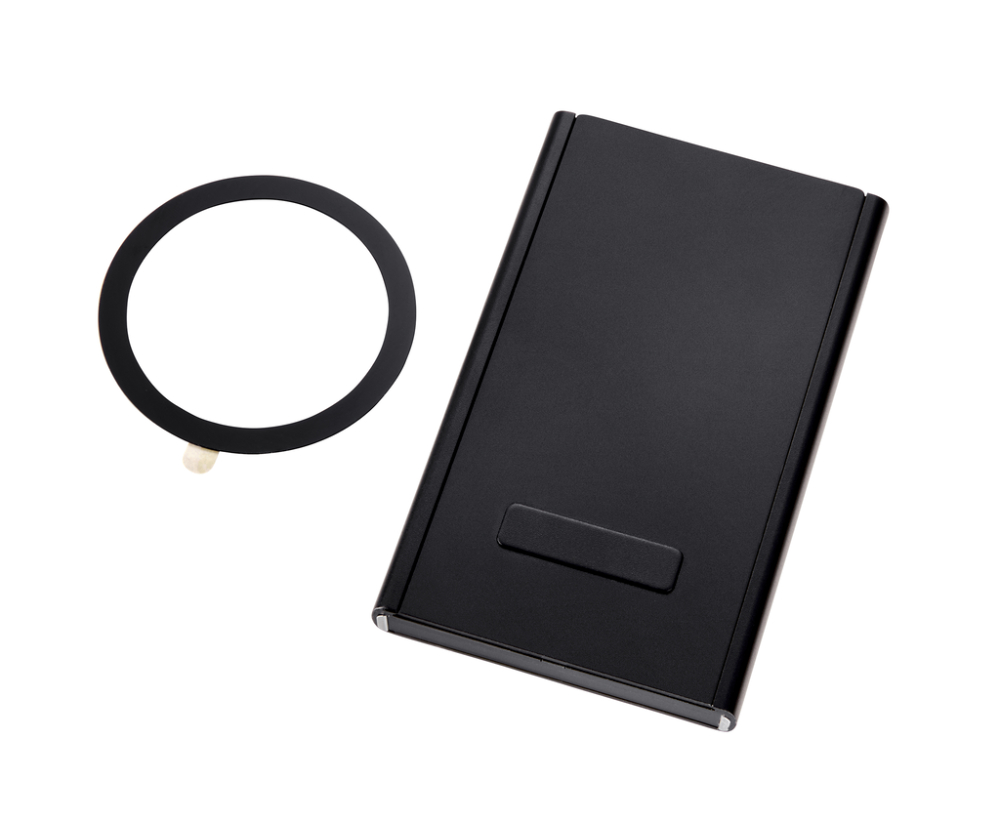 Kartenetui MagSafe, Etui für bis zu sechs Karten (Führerschein, Ausweis, Kreditkarte, usw.), geheimer Schiebemechanismus auf der Front, RFID Schutz (Ausleseschutz), starker Magnet (N52) auf der Rückseite zum Befestigen am Handy, zusätzlicher selbstklebender MagSafe Metallring mit 3M Klebefläche zur individuellen Befestigung, z.B. an allen gängigen Smartphones, Hüllen, Notizbüchern, etc., Aluminium, schwarz