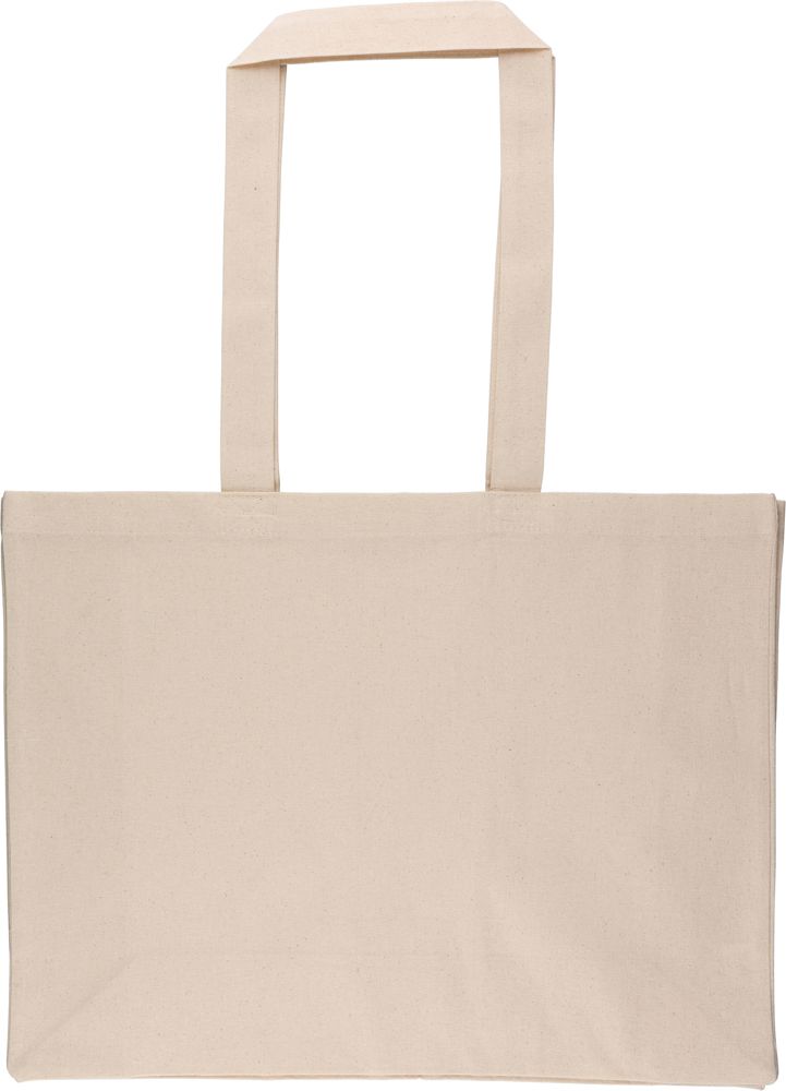 Einkaufstasche aus Baumwolle (180 g/m²) in Naturfarbe mit D-förmiger Lasche. Größe 43 × 34 × 13 cm mit 67 cm langen Henkeln (3 cm breit). Dieses Produkt ist OEKO-TEX® STANDARD 100 zertifiziert.