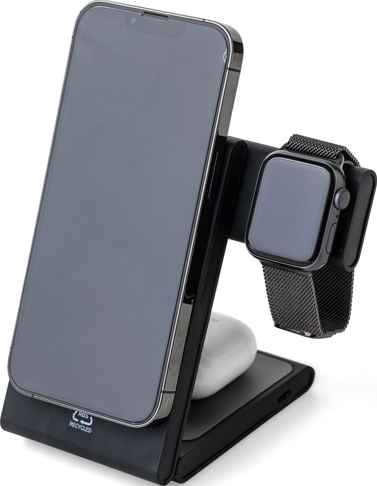 Magnetische 3-in-1-Ladestation aus recyceltem ABS für Smartphone, Smartwatch und Ohrhörer. Ultraflaches Design mit klappbarem Ständer. Ladeleistung: Smartphone 15 W, AirPods 5 W, Apple Watch 2 W. Eingang: 5 V/3 A oder 9 V/3 A, Ausgang: bis zu 9 V/1,67 A. Mit Recycling-Logo. Einzeln verpackt in einem braunen Karton.