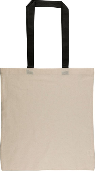 Einkaufstasche aus Baumwolle (140 g/m²) in Naturfarbe mit farbigen Griffen. Größe 38 × 42 cm mit 70 cm langen Griffen (2,5 cm breit). Dieses Produkt ist OEKO-TEX® STANDARD 100 zertifiziert.