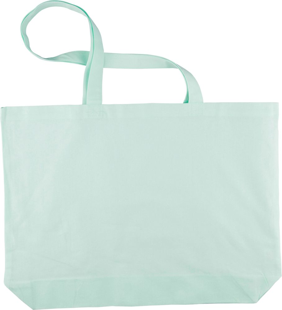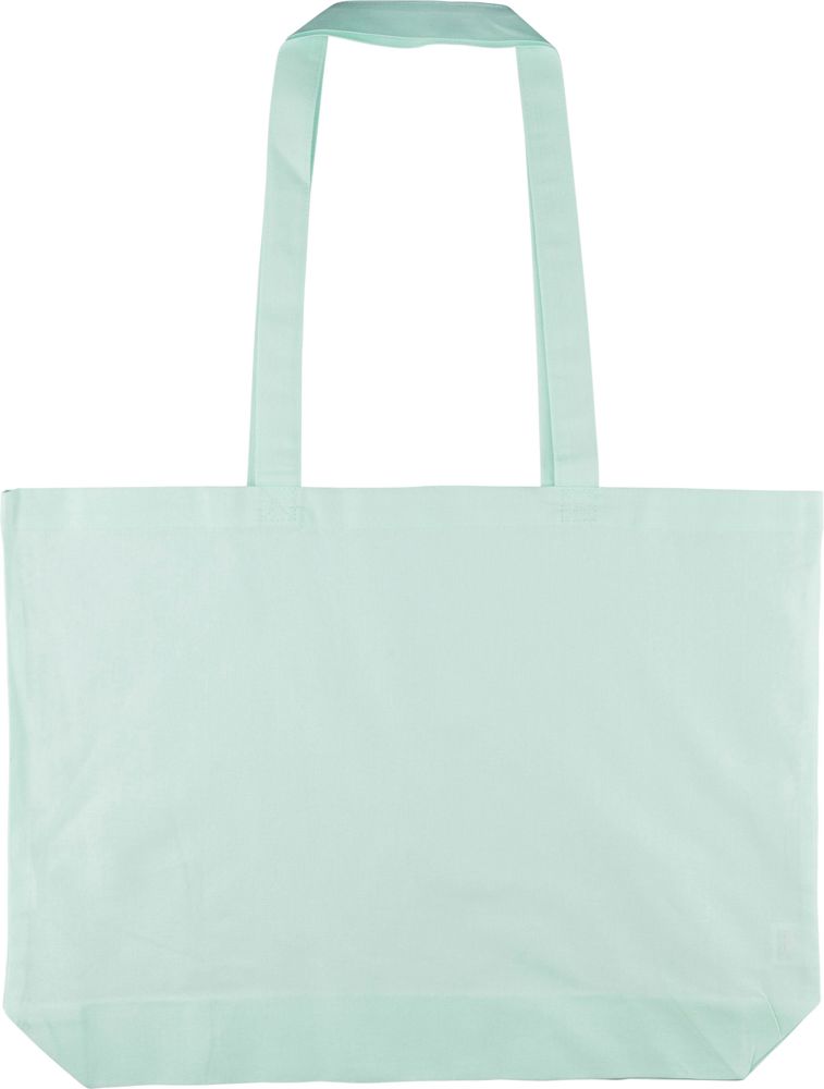 Einkaufstasche aus Baumwolle (140 g/m²) mit 10 cm Seitenfalte und langen Henkeln (70 cm Länge, 2,5 cm Breite). Pastellfarbene Baumwolle in PMS 9562U (grün), 162U (orange), 317U (blau) und 522U (lila). Dieses Produkt ist OEKO-TEX® STANDARD 100 zertifiziert.