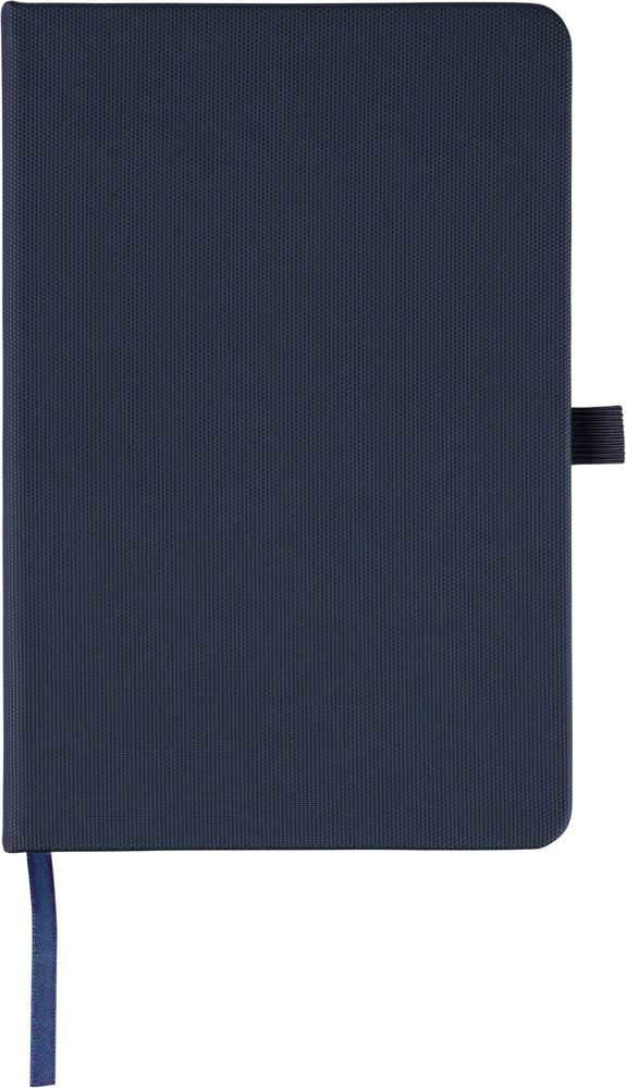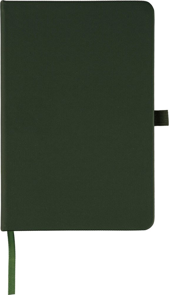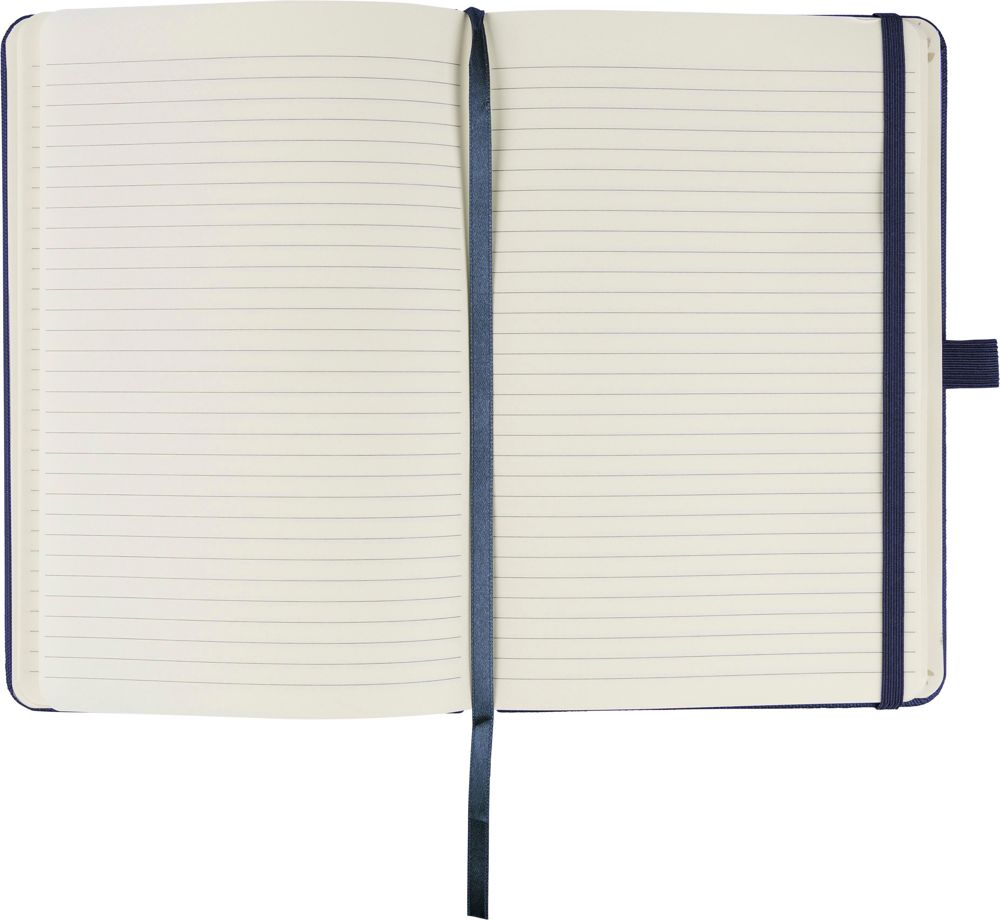 Notizbuch aus rPET-600D-Polyester mit PU-Beschichtung im Papierformat A5. Es enthält 80 Blatt liniertes Papier mit einer Grammatur von 70 g/m² und verfügt über ein Lesezeichenband, ein Gummiband sowie eine Stifthalterung. Das Cover ist halbgebunden. Auf der Rückseite ist ein geprägtes Recycling-Logo zu sehen.