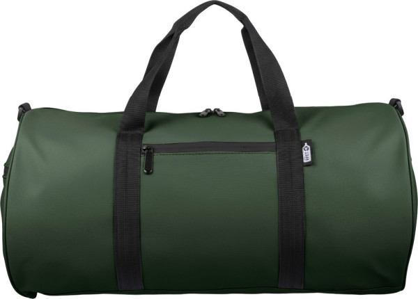 rPET-Reisetasche aus 600D Polyester mit 210D Futter und wasserabweisender PU-Beschichtung. Mit großem Hauptfach mit Reißverschluss, kleiner Reißverschluss-Fronttasche zur Dekoration, zusätzlicher kleiner Reißverschluss-Seitentasche und einer Netz-Seitentasche. Ausgestattet mit zwei Tragegriffen und einem verstellbaren Schultergurt. Fassungsvermögen 40 Liter. Inklusive rPET-Etikett auf der Außenseite.