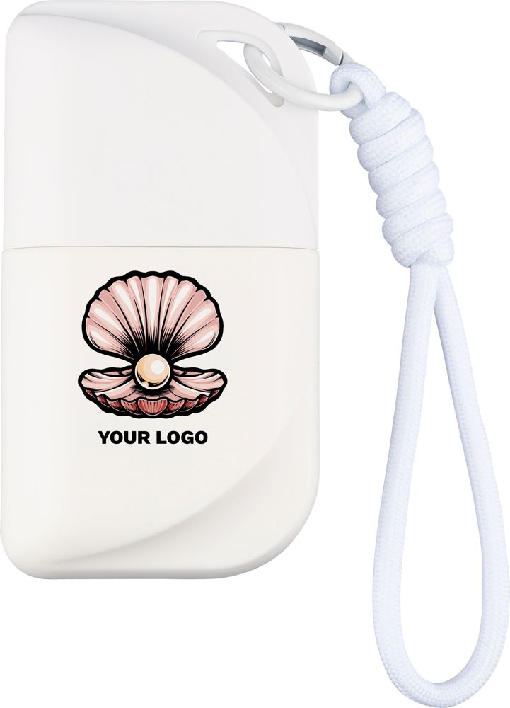 PP-Kassette mit 50 ml Sonnenschutzlotion (LSF 50) sowie einem farblich passenden Polyester-Handgelenkband mit Metallhaken. Auf der Rückseite befindet sich ein Aufkleberheftchen.