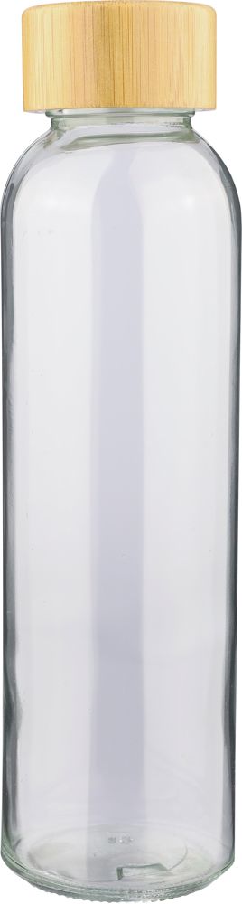 Glas-Trinkflasche (500 ml) mit mattiertem Körper und Schraubverschluss aus Bambus mit PP-Innenkern. Sie ist aus Natrium-Kalzium-Glas hergestellt und nur für kalte Getränke geeignet. Die Flasche ist einzeln in einem braunen Karton verpackt.