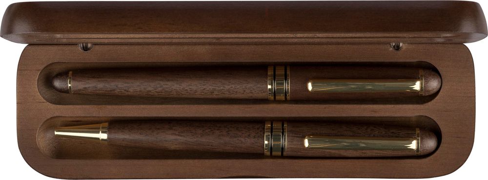 Dieses Schreibset aus Walnussholz und Messing besteht aus einem Drehkugelschreiber mit Metallspitze, Clip und Zierring sowie einem Rollerball. Beide sind mit einer deutschen Dokumentenmine in Blau ausgestattet. Die ungefähre Schreiblänge beträgt beim Kugelschreiber 1.000 Meter und beim Rollerball bis zu 400 Meter. Die Lieferung erfolgt in einer Ahorn-Holzbox und einem braunen Karton.