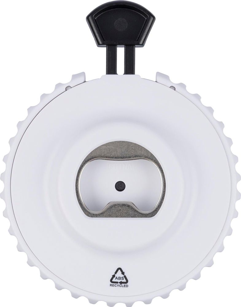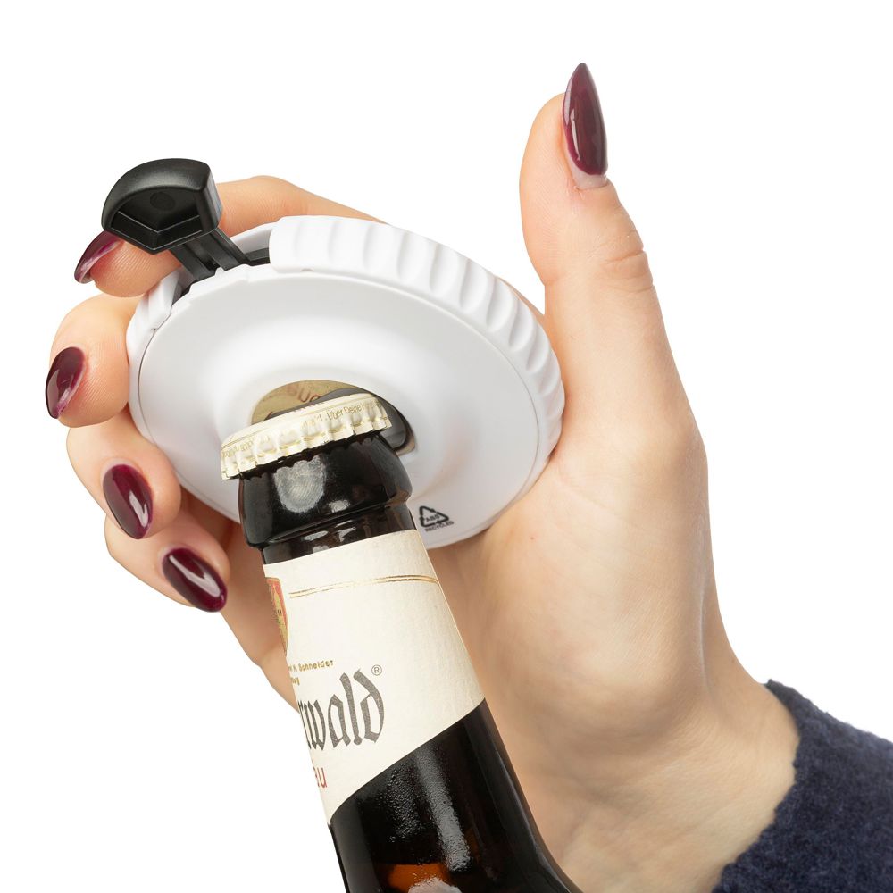 Mechanischer Würfel aus recyceltem ABS verfügt über einen Druckknopf auf seiner Oberseite. Durch Drücken wird der interne Mechanismus aktiviert und eine Zufallszahl zwischen 1 und 6 angezeigt. Auf der Rückseite befindet sich ein Flaschenöffner und ein kleines Recycelt (ABS)-Logo. Der Würfel ist in einem recycelten Polybeutel verpackt.