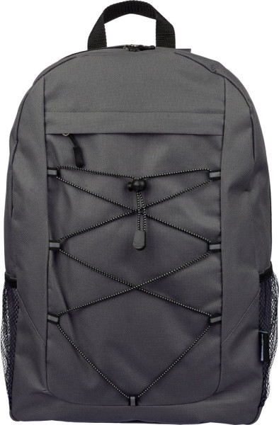 Abenteuerrucksack aus rPET-Polyester 600D mit Kordelzugverschluss und großem Hauptfach mit Reißverschluss. Mit Netzseitentaschen, elastischen Frontbändern zur Befestigung einer Decke oder Flasche und einer kleinen offenen Reißverschluss-Fronttasche zur Dekoration. Inklusive verstellbarer Riemen und rPET-Etikett.