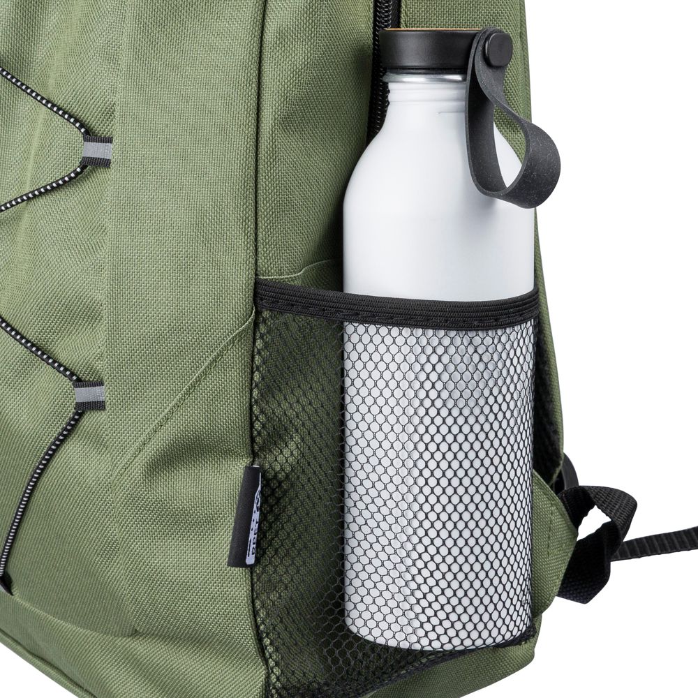 Abenteuerrucksack aus rPET-Polyester 600D mit Kordelzugverschluss und großem Hauptfach mit Reißverschluss. Mit Netzseitentaschen, elastischen Frontbändern zur Befestigung einer Decke oder Flasche und einer kleinen offenen Reißverschluss-Fronttasche zur Dekoration. Inklusive verstellbarer Riemen und rPET-Etikett.