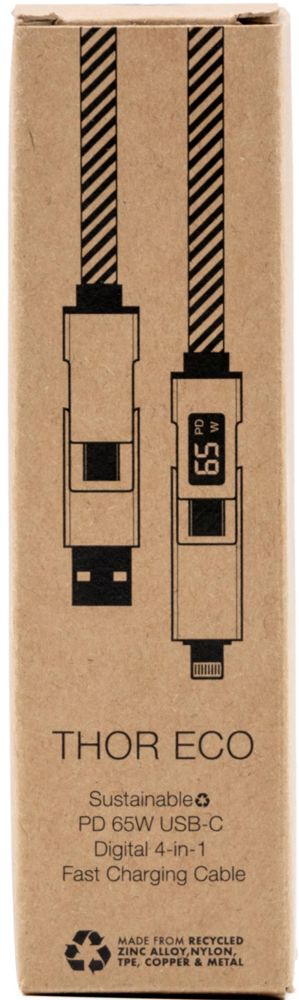 Das BrandCharger Thor Eco 4-in-1-Kabel ermöglicht hochwertiges Schnellladen mit einem nachhaltigen Ansatz. Das 120 cm lange Kabel aus strapazierfähigem, recyceltem Nylon unterstützt mehrere Anschlüsse und verfügt über Eingänge für Typ C und USB-A sowie Ausgänge für Typ C und Lightning. Es ist auf Effizienz ausgelegt und liefert bis zu 65 W von Typ-C auf Typ-C, 27 W von USB-C auf Lightning, 27 W von USB-A auf Typ-C sowie 12 W von USB-A auf Lightning. Das Thor Eco unterstützt die USB-2.0-Datenübertragung und vereint umweltfreundliche Materialien, Vielseitigkeit und starke Leistung in einer unverzichtbaren Ladelösung.
