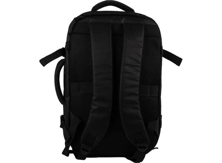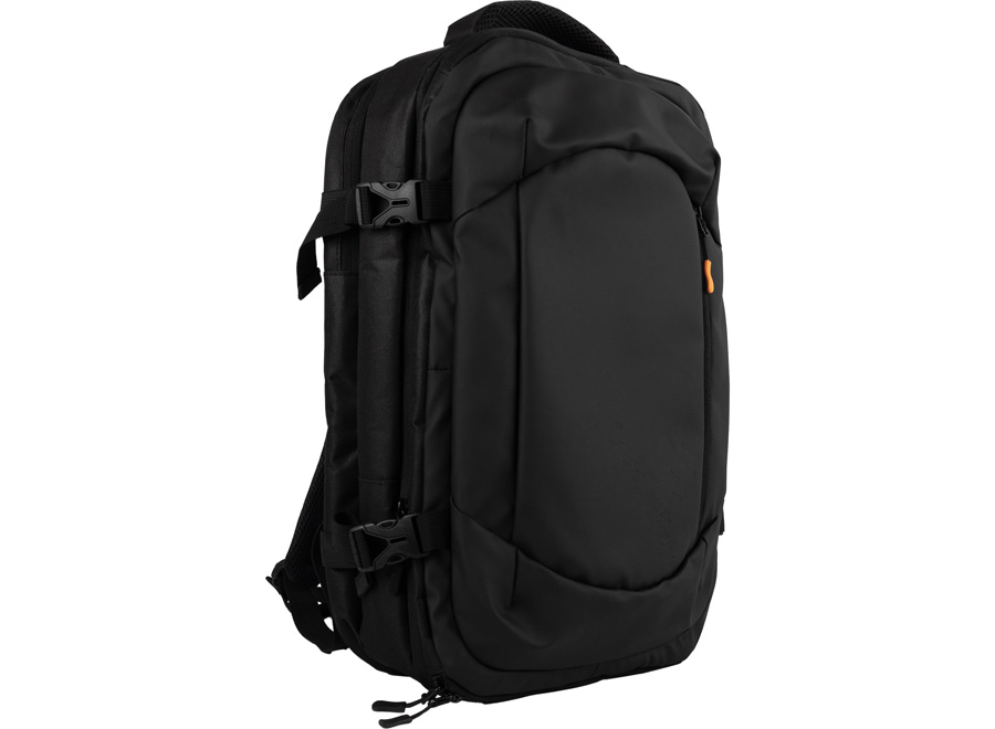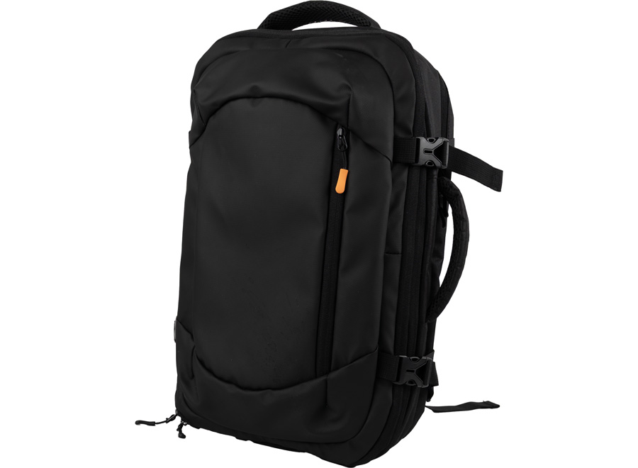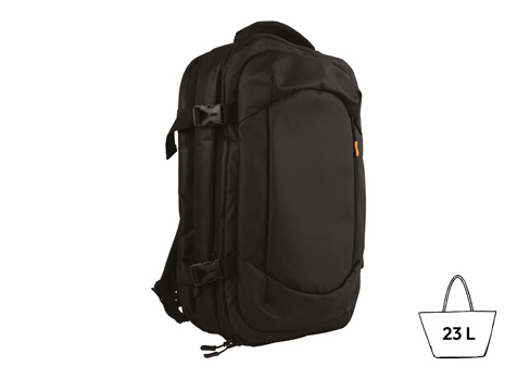 Rucksack aus 900D Vinyl / PU, 369g/m². 3 Staufächer. Große Fronttasche mit seitlichem Reißverschluss. Geräumiges Hauptfach mit Dehnfalte, kompletter Öffnung und Gurten zum Fixieren von Kleidung. Separates Laptopfach mit gepolsterter Trennwand und elastischem Haltegurt. 2 Kompressionsriemen auf jeder Seite, sowie atmungsaktive Rückenpolsterung und gepolsterte Schultergurte. Verstärkte Tragegriffe an Ober- und Seitenteil der Tasche. Maximales Fassungsvermögen: 23?L.