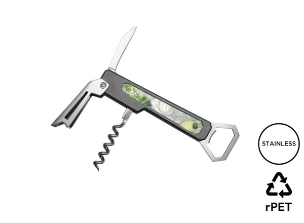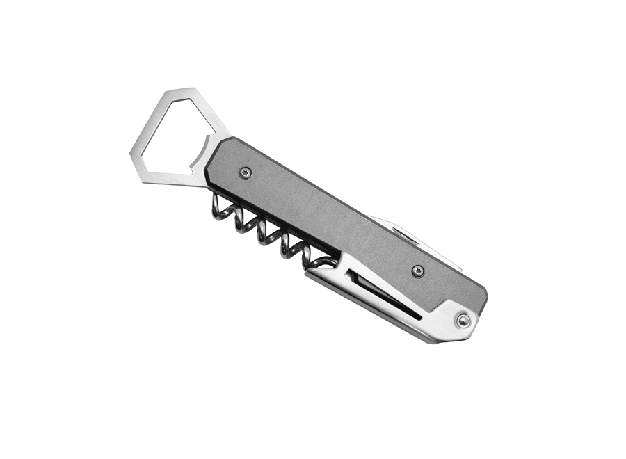 Professioneller Korkenzieher. Griff aus Edelstahl und Aluminium mit transparentem Kunststoffeinsatz. Korkenzieherende mit 5 Spiralen aus Edelstahl. Kapselschneider. Schneller Flaschenöffner. Inklusive einer grau melierten Hülle aus RPET.