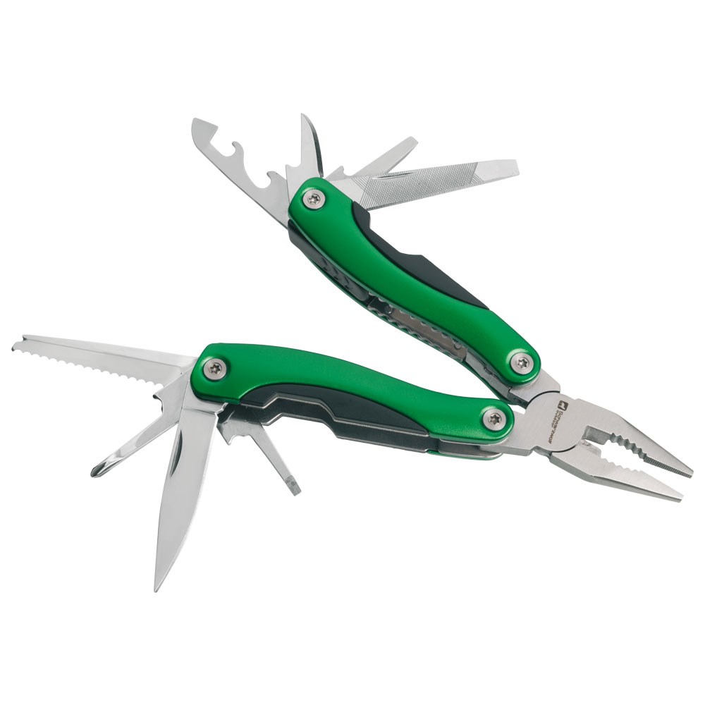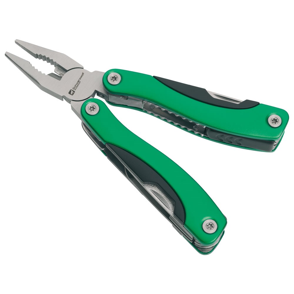 Multitool mit 15 Werkzeugen im schwarzen Neoprenetui mit Gürtelschlaufe. Die Werkzeuge sind zum Gebrauch arretierbar. Verpackt in einer Schwarzwolf outdoor Geschenkbox. Material: rostfreier Stahl, Aluminiumgriff mit rutschfester Oberfläche Empfohlene Veredelungstechnik: Tampondruck T3, Lasergravur L1 Maximale Veredelungsgröße: 30 × 8 mm Abmessungen im geschlossenen Zustand: 10 × 4,5 × 2 cm