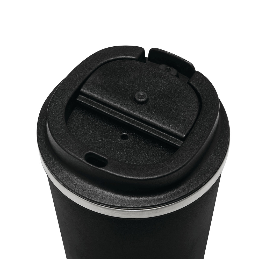 Vakuum-Isolierbecher VELOMUG, doppelwandig: innen aus recyceltem Edelstahl und außen aus Edelstahl, farblich passender Kunststoff-Deckel mit sicherem Schraubverschluss, Silikon-Dichtring und integrierter Trinköffnung zum Aufklappen, gummierter Boden für gute Oberflächenhaftung, Füllmenge ca. 350 ml, hält ca. 8 Stunden warm und bis zu 12 Stunden kalt, in Box