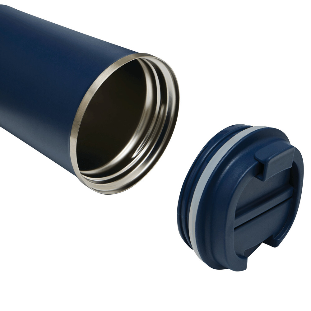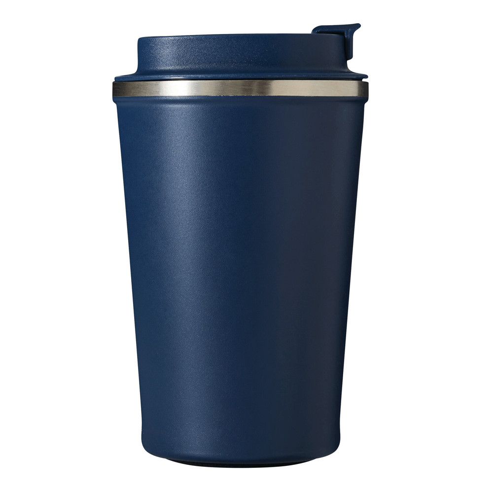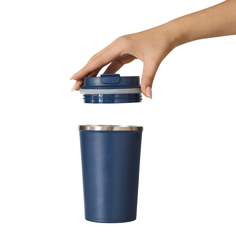 Vakuum-Isolierbecher VELOMUG, doppelwandig: innen aus recyceltem Edelstahl und außen aus Edelstahl, farblich passender Kunststoff-Deckel mit sicherem Schraubverschluss, Silikon-Dichtring und integrierter Trinköffnung zum Aufklappen, gummierter Boden für gute Oberflächenhaftung, Füllmenge ca. 350 ml, hält ca. 8 Stunden warm und bis zu 12 Stunden kalt, in Box