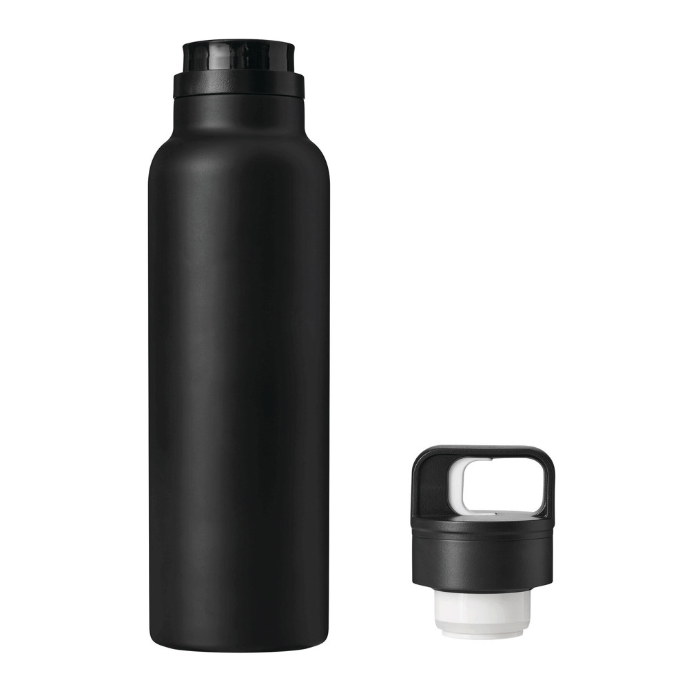 Vakuum-Isolierflasche TRAVELCLICK, doppelwandig: innen und außen aus Edelstahl, schwarzer Kunststoff-Deckel mit Einhand-Klickverschluss, Silikon-Dichtring und Tragegriff, Füllmenge ca. 750 ml, hält ca. 8 Stunden warm und bis zu 12 Stunden kalt, in Box