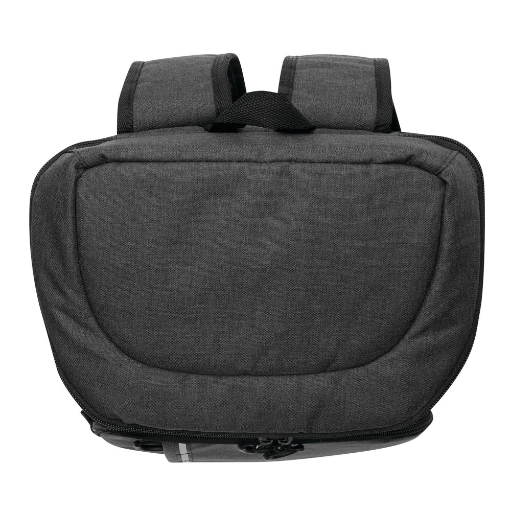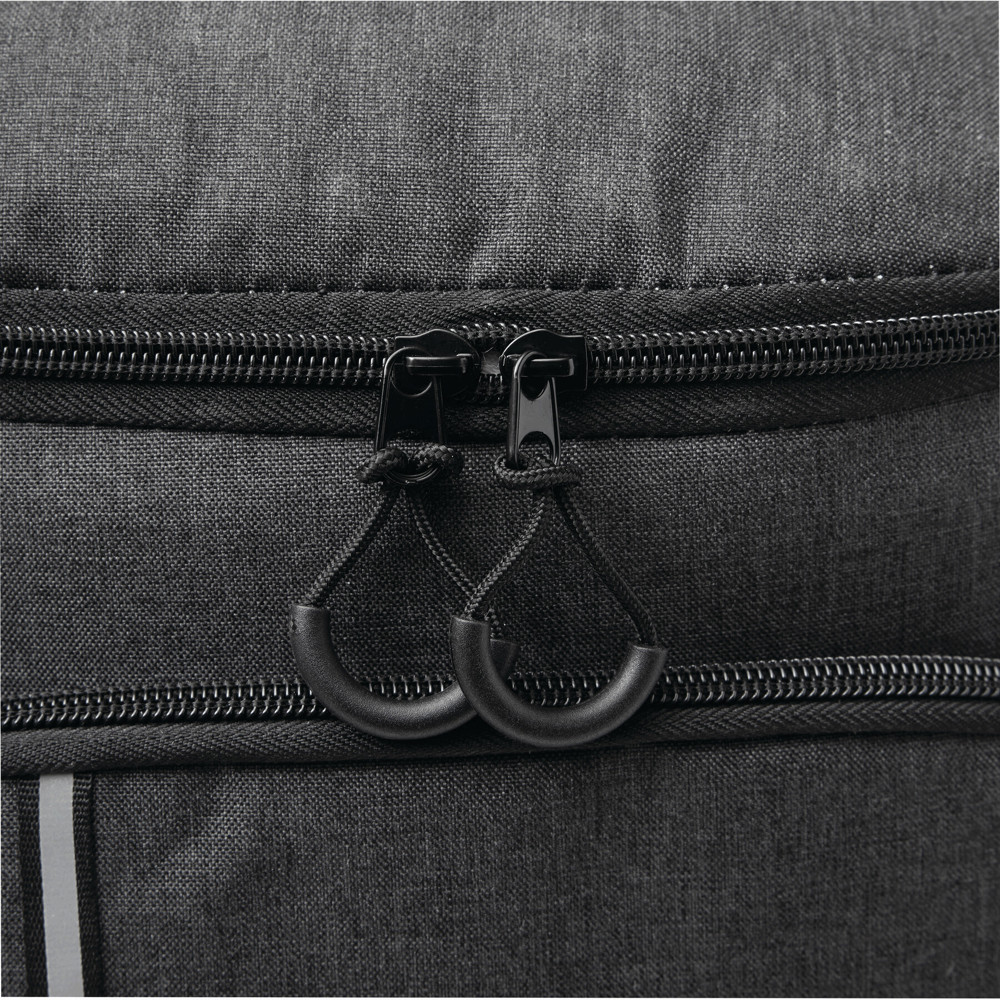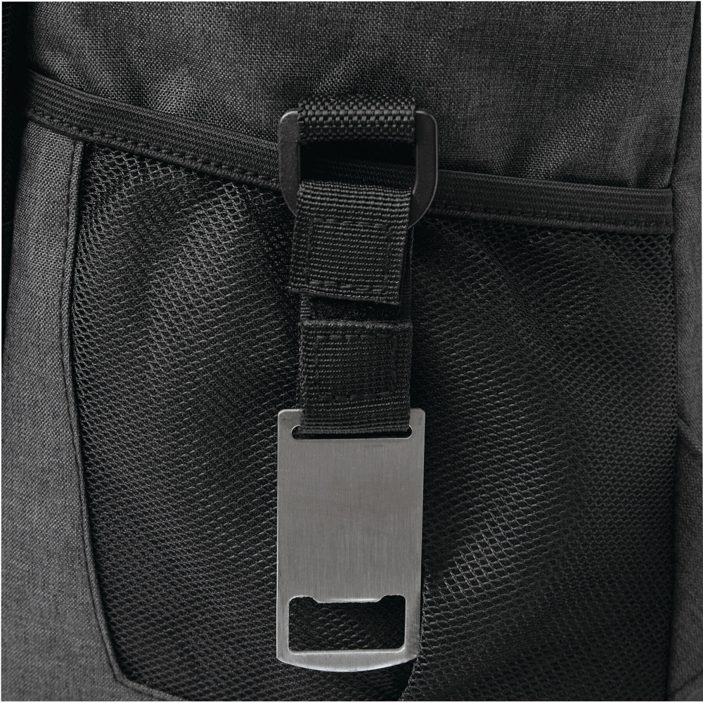 Kühlrucksack YUKON: 1 großes isoliertes Reißverschluss-Hauptfach mit PEVA-Futter, 1 Reißverschluss-Vorfach mit Reißverschluss-Netzfach, 1 vertikales Reißverschluss-Vorfach mit reflektierendem Streifen, 2 seitliche Netzfächer, 1 abnehmbarer Flaschenöffner aus Edelstahl, wasserabweisender Boden, verstellbare gepolsterte Schultergurte, Tragegriff