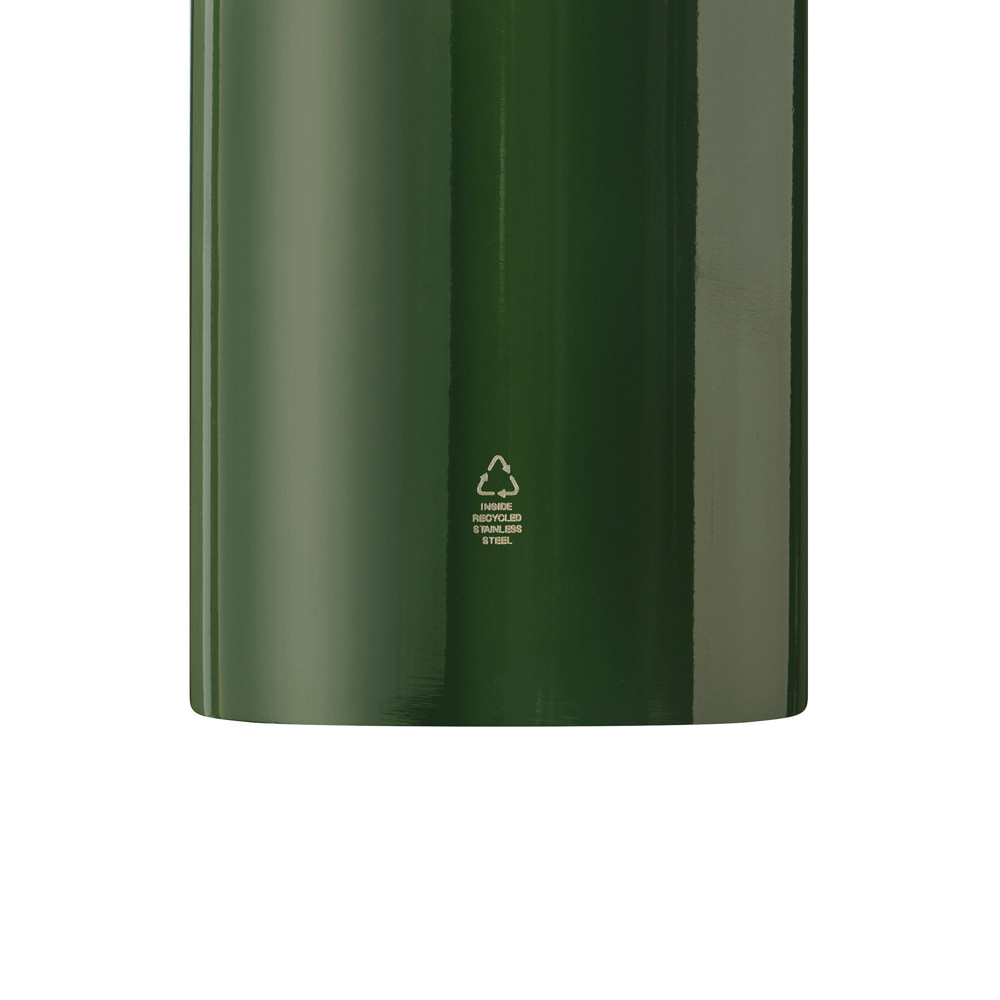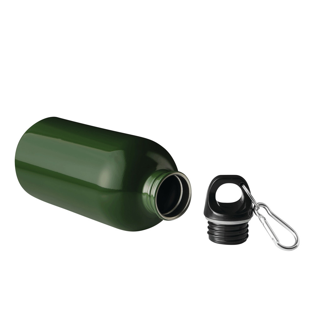 Trinkflasche SMALLTRANSIT, einwandig: aus recyceltem Edelstahl, schwarzer Kunststoff-Deckel mit sicherem Schraubverschluss, Silikon-Dichtring, Tragegriff, Schlüsselring und Karabinerhaken (der Karabiner ist NICHT als Sicherung beim Klettern geeignet), Füllmenge ca. 550 ml