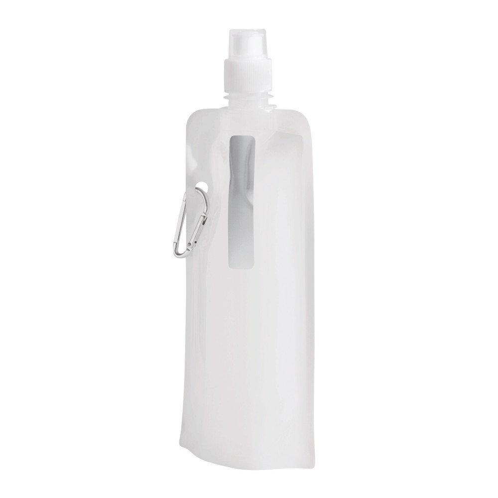Trinkflasche AQUAFOLD: falt-, bzw. rollbar im ungefüllten Zustand, transparente Verschlusskappe, mit Karabinerhaken (der Karabiner ist NICHT als Sicherung beim Klettern geeignet), Füllmenge ca. 400 ml