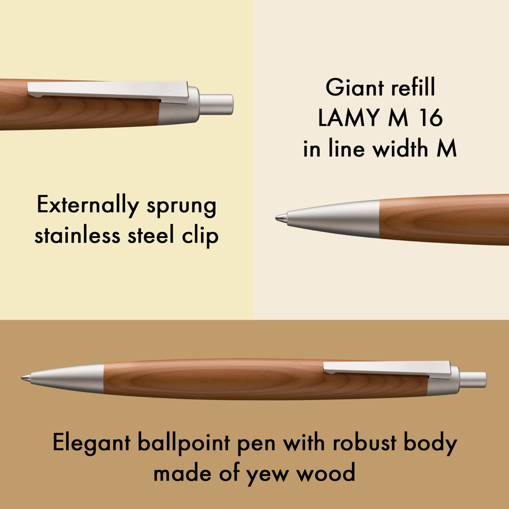 Am Anfang war der LAMY 2000: Seit 1966 schreibt die Ikone Designgeschichte. Damals wie heute ist der LAMY 2000 ein fester Ankerpunkt des LAMY Designs. Er sticht vor allem durch sein hohes Niveau an Ingenieurskunst heraus und verkörpert eine einzigartige Symbiose aus Ästhetik und Funktionalität. Erleben Sie ein Schreibgefühl der Premiumklasse dank nahtloser Materialkombinationen, fremdgefedertem Edelstahlclip und angenehmer Ausbalancierung des Körpers. Kugelschreiber aus exklusivem, hochwertigem Eibenholz, Beschläge in hochwertigem Palladium-Finish, abgefederter Edelstahlclip