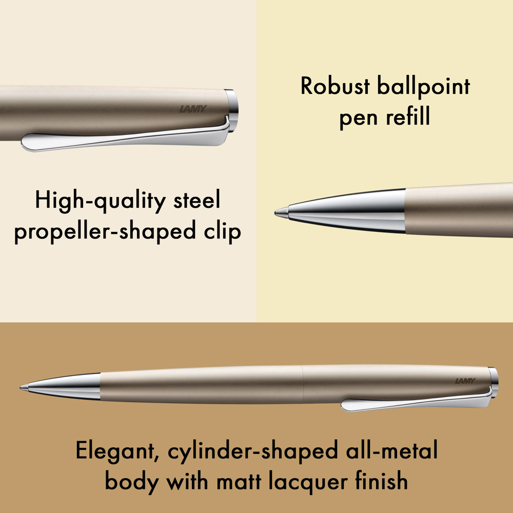 Der LAMY studio überzeugt mit zeitloser Eleganz und universellem Design. Die bauchige Zylinderform seines Körpers aus Ganzmetall ergibt sich nahtlos aus den einzelnen Gehäuseteilen und ist dabei bewusst minimalistisch gehalten. Die sanfte Wölbung und die harmonischen Proportionen machen den Clip zum Markenzeichen des LAMY studio: Er setzt der sachlichen Grundform einen innovativen gestalterischen Akzent entgegen und erzeugt ein einzigartiges Gesamtbild.