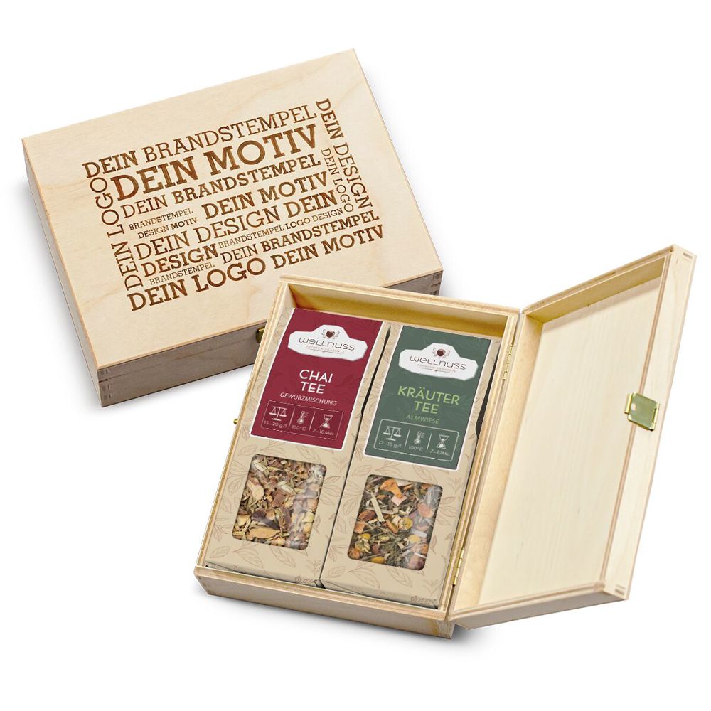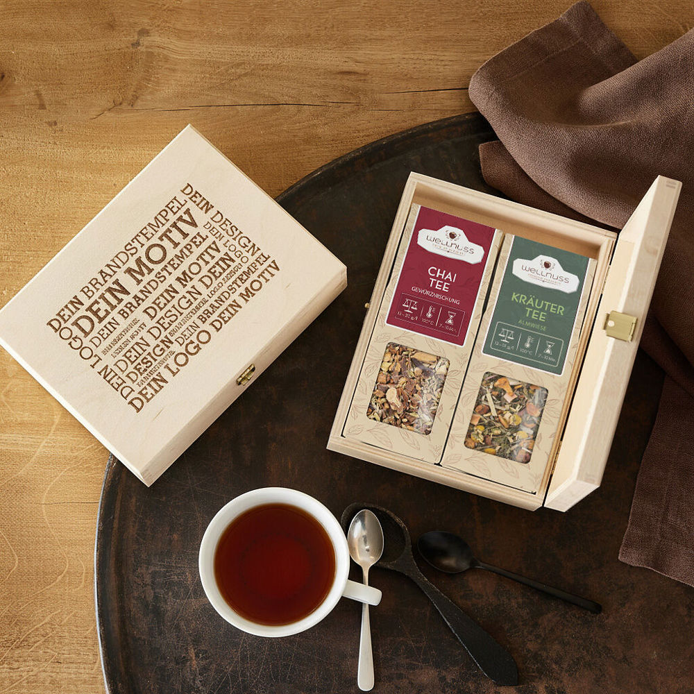Ab 50 Stück mit Ihrem Branddruck auf dem Deckel der Birkenholzbox: Ein Geschenk liebevoll und nachhaltig zu verpacken, bereitet Freude. Deshalb lassen wir unsere Premium Präsentboxen in einem Familienbetrieb von Hand fertigen und Ihr Logo in den Deckel einbrennen. So entsteht ein Premium Präsent mit Langzeit-Werbeeffekt. Wählen Sie aus folgenden Tee Spezialitäten: Schwarzer Tee Darjeeling, Grüner Tee Japan Bancha, Kräutertee Almwiese oder Chai Gewürzmischung Sie suchen eine andere Größe? Dieses Premium Präsent ist auch mit 3, 4 oder 8 Snacks erhältlich.